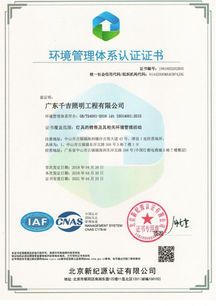 千吉-環(huán)境管理體系認(rèn)證證書